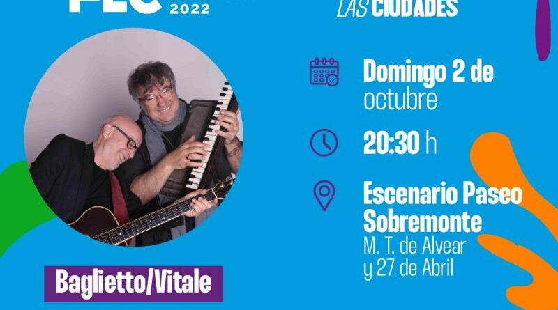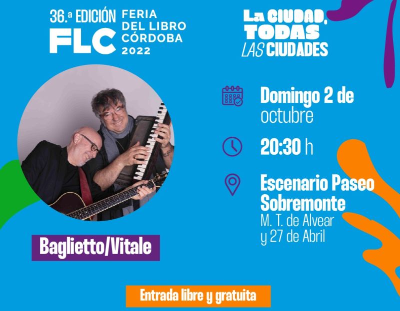 Juan Carlos Baglietto y Lito Vitale se presentarán hoy domingo 2 de octubre, a las 20:30, en el escenario del Paseo Sobremonte en el marco de la Feria del Libro Córdoba 2022.