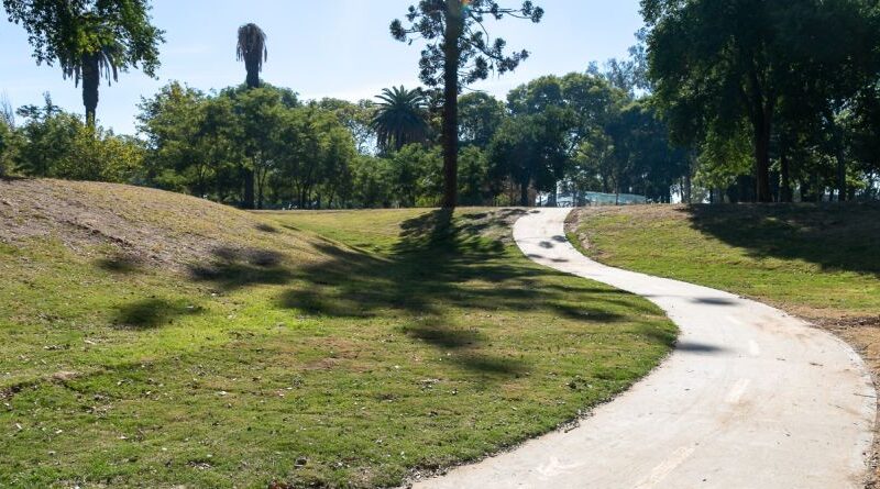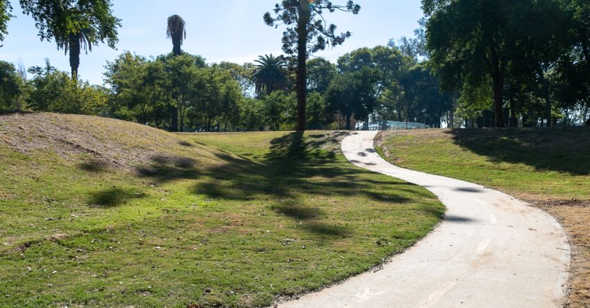 Sobre el espacio verde se sumó un circuito peatonal interno con asfalto, un material más amigable al impacto. De esta manera se separan los usos de la bicicleta con los de corredores y aquellos que desean recorrer el Parque a pie.