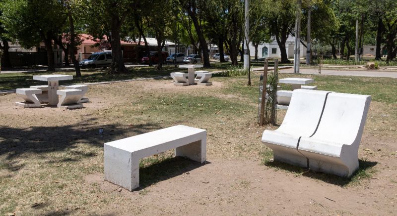 La iluminación LED está siendo potenciada y se suma nuevo mobiliario de hormigón de mesas, sillas y bancos, distribuidos en todo el espacio verde. Además, se agregó un mangrullo con toboganes.