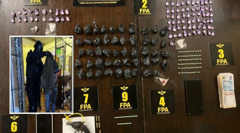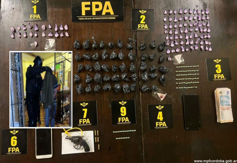 Durante el registro del local comercial, se incautaron 540 dosis de cocaína y 292 dosis de marihuana, 194 comprimidos de psicofármacos, dinero, un revólver calibre .22 con cinco cartuchos, elementos de corte y fraccionamiento, y diversos elementos de interés para la causa.