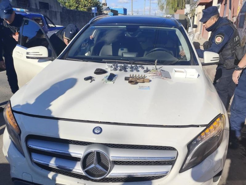 Se detuvo ayer en Villa El Libertador a un joven de 23 años de edad junto al secuestro de un automóvil marca Mercedes Benz, una pistola 9mm marca Bersa con varios cartuchos, 113 envoltorios con una sustancia compatible con marihuana y clorhidrato de cocaína, un teléfono celular y una suma de dinero en moneda nacional y extranjera, según información policial.