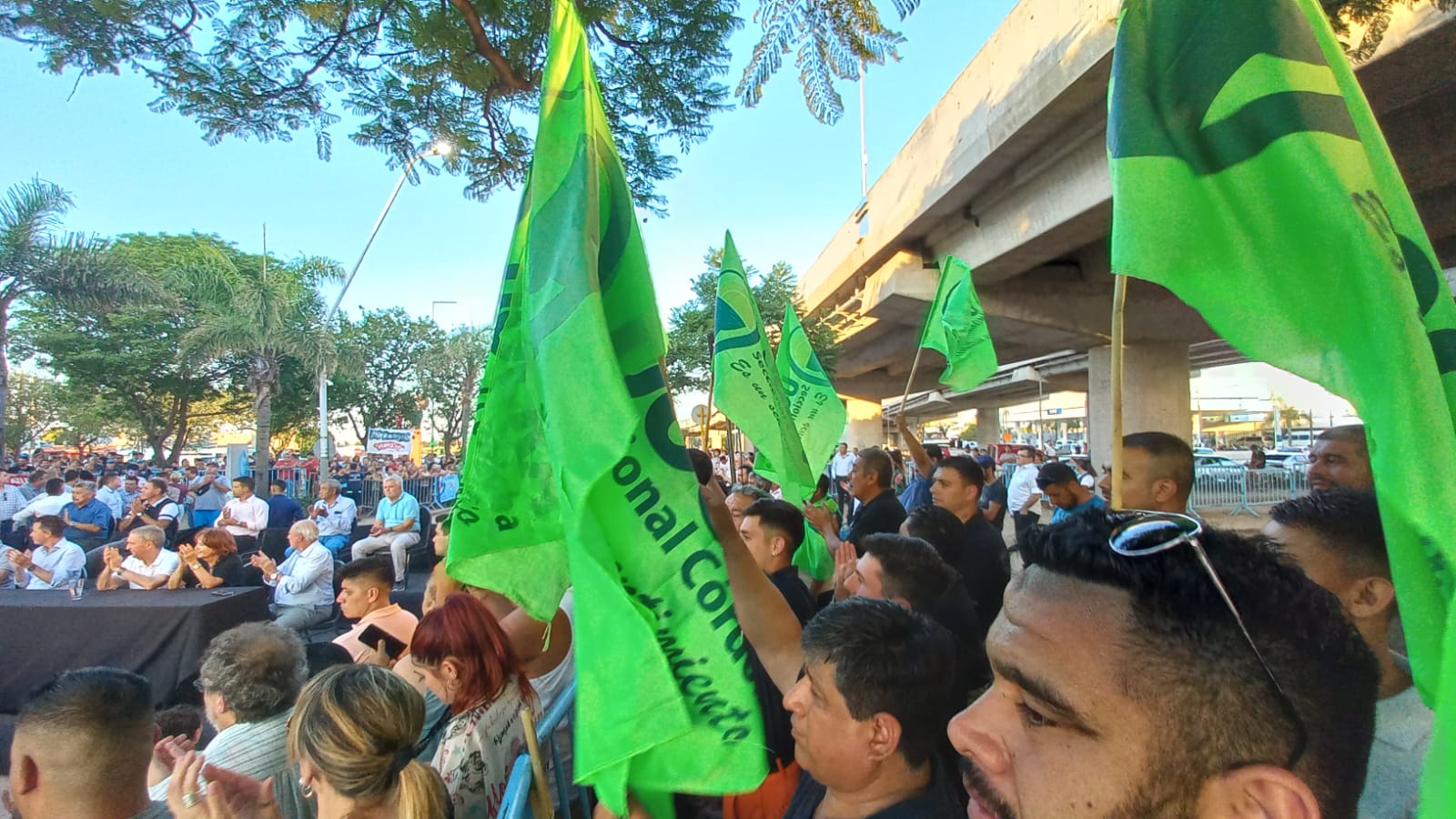 “Grande Juan”, lo avivaban dirigentes del gremio de la Uocra que asistieron con banderas como señal de agradecimiento por el trabajo creado por la obra.