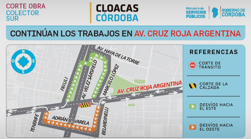 Por obras de cloacas que ejecuta el gobierno de la Provincia. Durante los próximos días los trabajos intervendrán la calzada de Av. Cruz Roja entre Av. Vélez Sarsfield y Maestro Marcelo López.