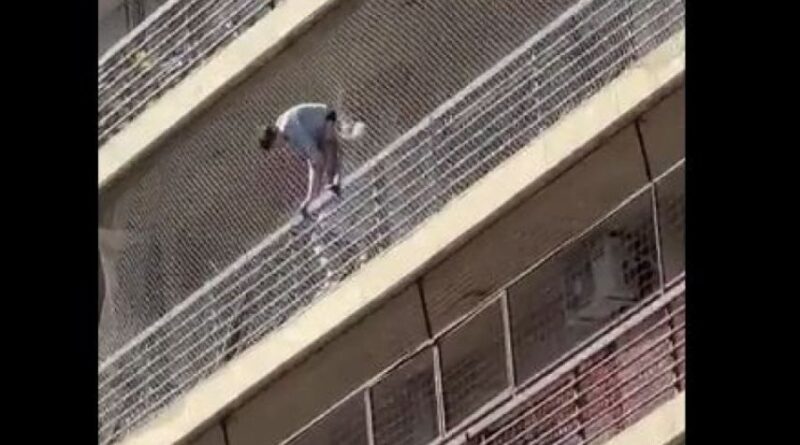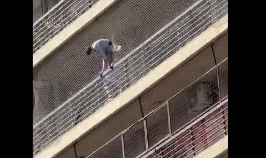 En las imágenes se ve cuando una persona lo agarra de los pies para que no caiga al vacío en su intento por bajar hasta el noveno piso agarrado de la red.