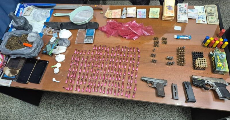 Durante el procedimiento se secuestraron dos armas de fuego calibre 11.25 y 7.65, una importante cantidad de municiones de distintos calibres, dos teléfonos celulares, una suma de dinero en moneda nacional y extranjera, un machete de 50 cm aprox., más de 115 dosis de clorhidrato de cocaína y marihuana, una balanza de precisión y un mortero, entre otros elementos.
