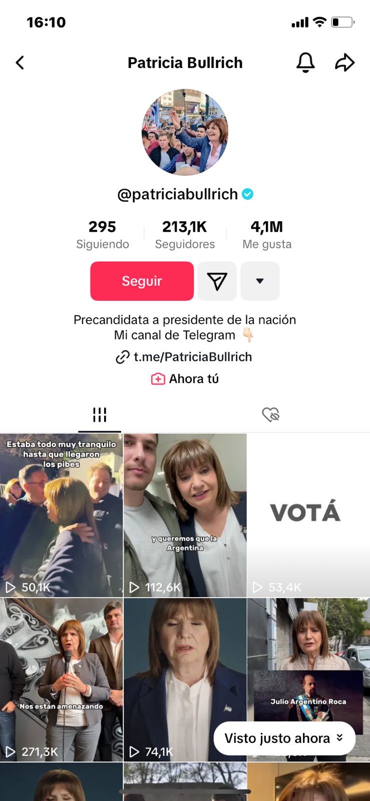 Patricia Bullrich tiene en TikTok 213,1 mil seguidores y 569 mil, en Instagram. Sus posteos aquí recogen entre 20 mil y 30 mil me gusta, muy lejos del centenar de miles del libertario.