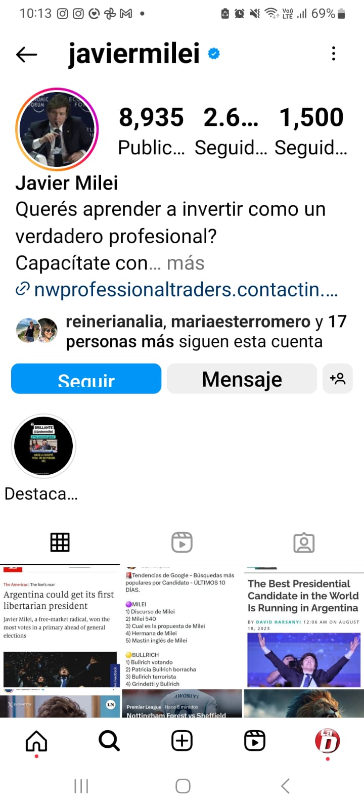 En Instagram, por caso, Milei aumenta el caudal de seguidores: 2,6 millones y, también, sus posteos son validados por un centenar de miles de me gusta.