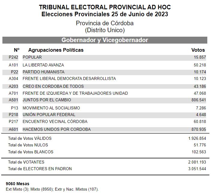 El Tribunal Electoral de la Provincial (TEP), integrado por los vocales Marta Elena Vidal, Jorge Namur y Leonardo González Zamar, comunicó hoy los resultados del escrutinio definitivo de los comicios de renovación de autoridades provinciales, celebrados el domingo 25 de junio de 2023. El anuncio se formalizó una vez terminada la carga del 100% de las actas validadas.
