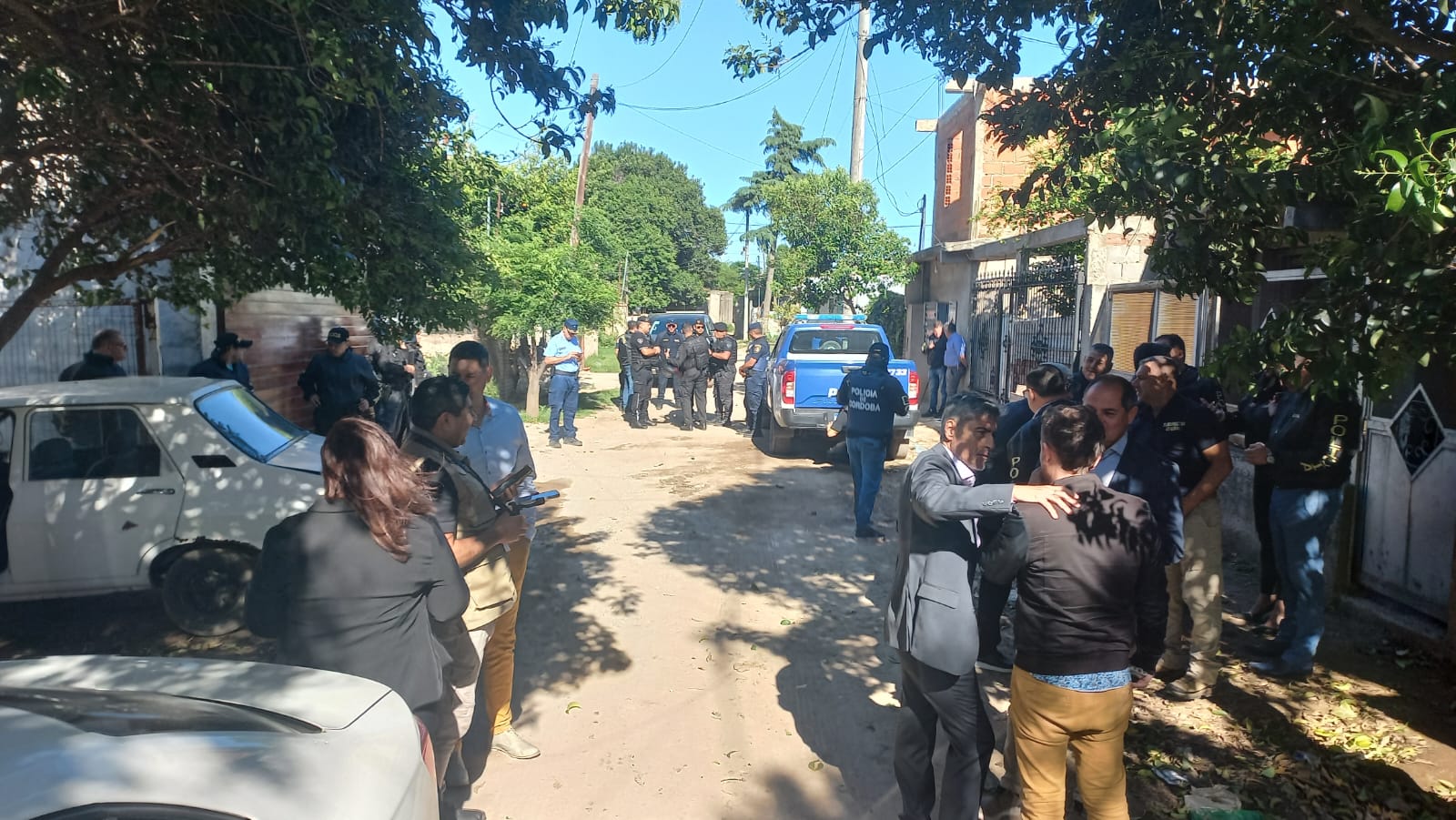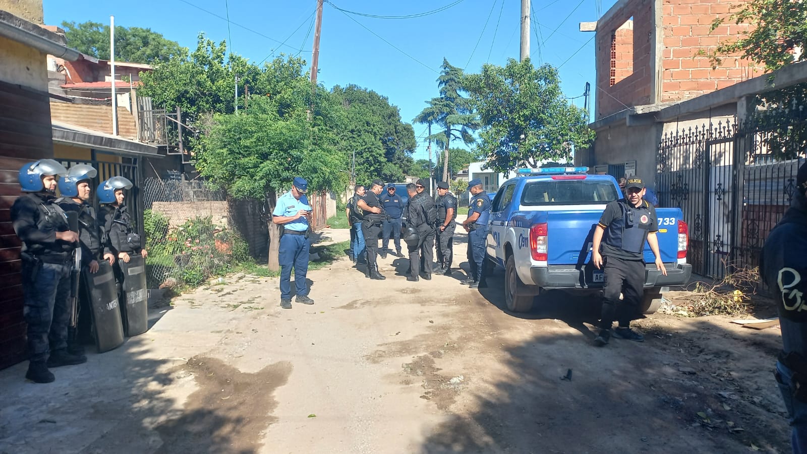 Las nueve de la mañana, en barrio cooperativo Pilcomayo, colindante a Arpeboch y patio trasero de Villa El Libertador. Ni perros se ven, ahuyentados por las balizas y sirenas, rojas y azules.