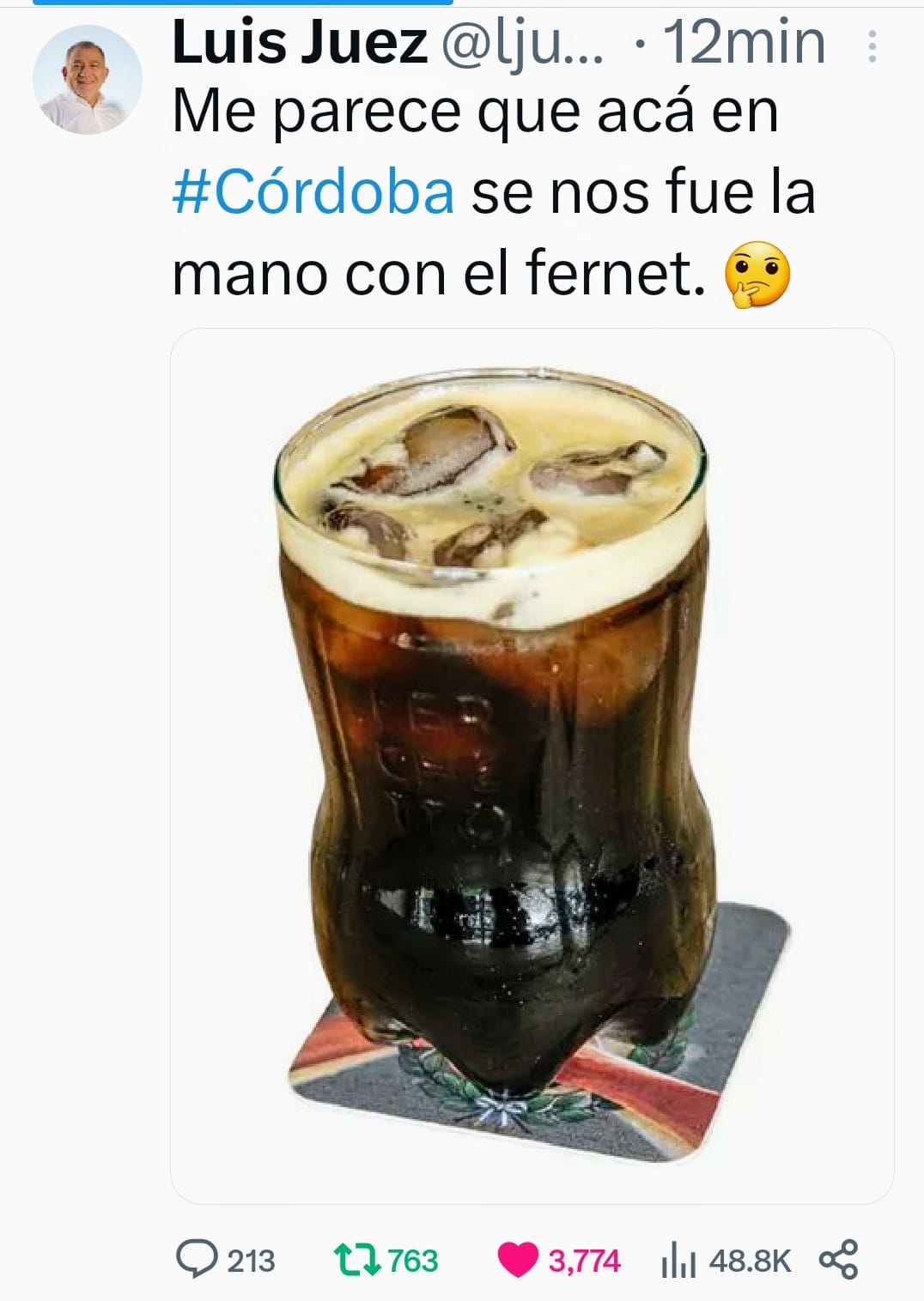 El senador nacional de Juntos por el Cambio, Luis Juez, resumió con un posteo en la red social X el sentimiento cordobés: “Me parece que acá en Córdoba se nos fue la mano con el fernet”, aludiendo a eso de la fórmula 70/30 superada por el libertario.