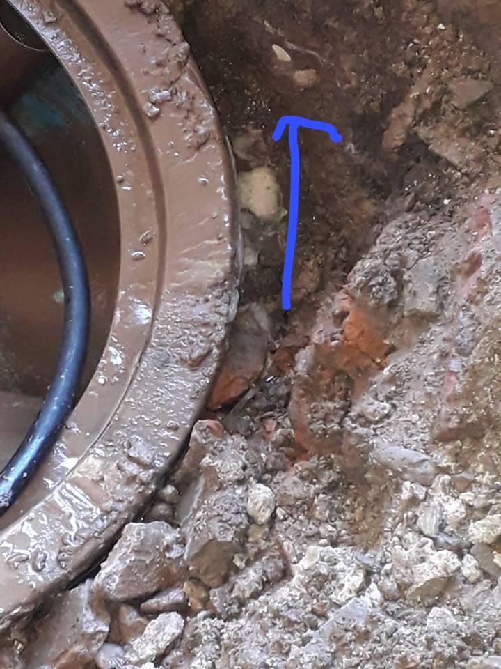 Además de las fotos, envió un video donde muestra cómo a través de una bomba prestada deben extraer el agua que sigue brotando del pozo desbordado. Esto también se ve en la foto con la flecha de color azul.