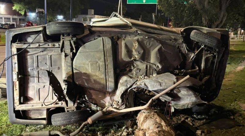 Un automóvil perdió el control, impactó contra un poste y volcó en la av La Voz del Interior.