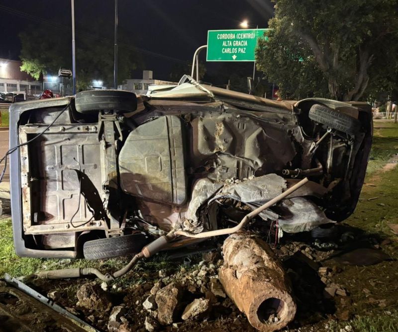 Un automóvil perdió el control, impactó contra un poste y volcó en la av La Voz del Interior.