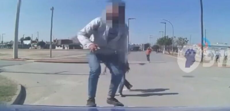El video de las cámaras de videovigilancia 911 muestra a uno de los vecinos, en un ataque de furia, subirse al capot de la unidad para agredir y tirar piedra.