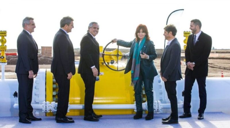 El presidente Alberto Fernández, la vicepresidenta Cristina Kirchner y el ministro de Economía, Sergio Massa, participaron juntos de la apertura de la primera válvula del gasoducto Presidente Néstor Kirchner, en el marco de la inauguración del primer tramo de la obra, en coincidencia con el Día de la Independencia.