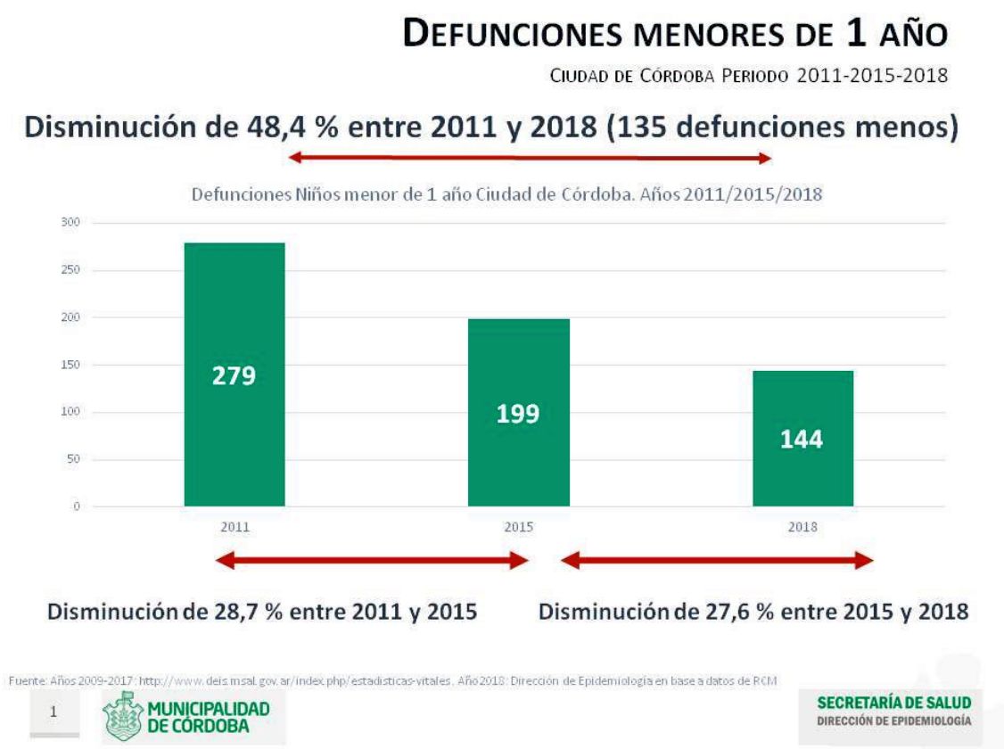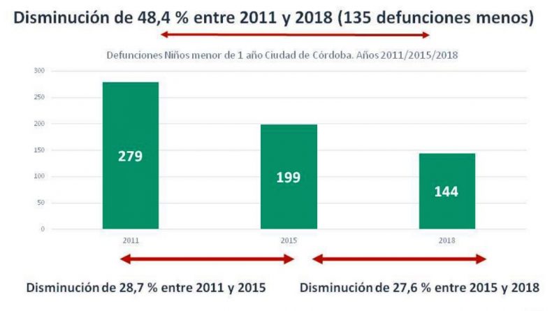 Así, en la ciudad de Córdoba, hasta el 31 de Diciembre de 2018 ocurrieron 144 defunciones de niños menores de 1 año; el valor acumulado indica una disminución de 20% respecto a igual periodo de 2017 (35) y una disminución de 48,4 % entre 2011 y 2018 (135 defunciones menos).
