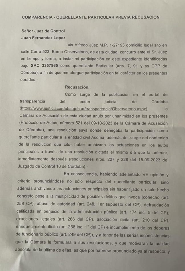 “Tengo sobradas sospechas que esto podría ser un pago al juez”, dijo Juez a Mitre Córdoba. Y agregó: “Estoy obligado a advertir que esto está sucediendo”.