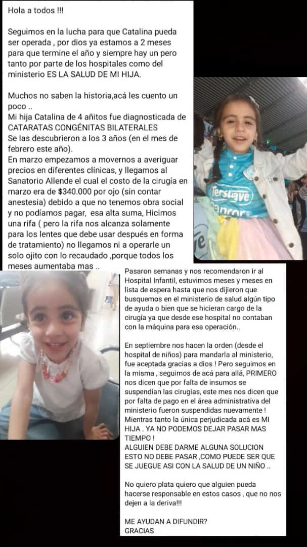“Ya tiene un ojito nublado, casi que no ve”, cuenta, preocupada y con desesperación, Jenny Baigorria, mamá de la pequeña quien compartió un posteo en las redes sociales y envió su caso a los medios de comunicación para lograr eco en las autoridades.