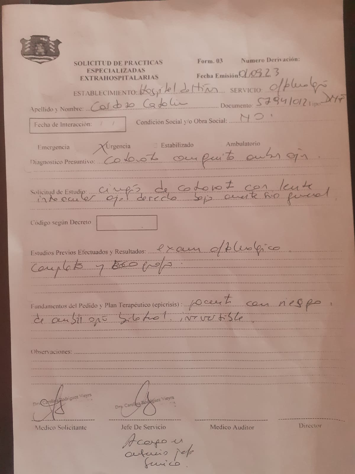 En setiembre pasado, desde el hospital de Niños provincial envían una solicitud de prácticas extrahospitalarias al Ministerio de Salud con el fundamento de que se trataba de una “paciente de riesgo”. Así se lee en la orden compartida abajo.