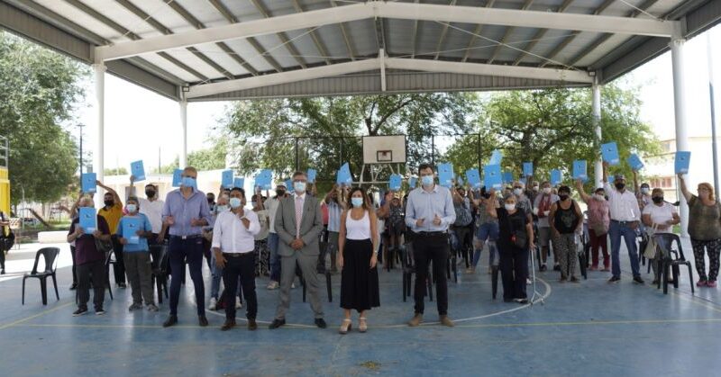 (Prensa Gobierno) Este jueves, el gobernador Juan Schiaretti, junto a la diputada nacional, Alejandra Vigo, y la ministra de Promoción del Empleo y de la Economía Familiar, Laura Jure, entregó 77 escrituras sociales en barrio Ampliación Cabildo, en el marco del programa Tu Casa Tu Escritura.