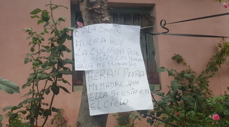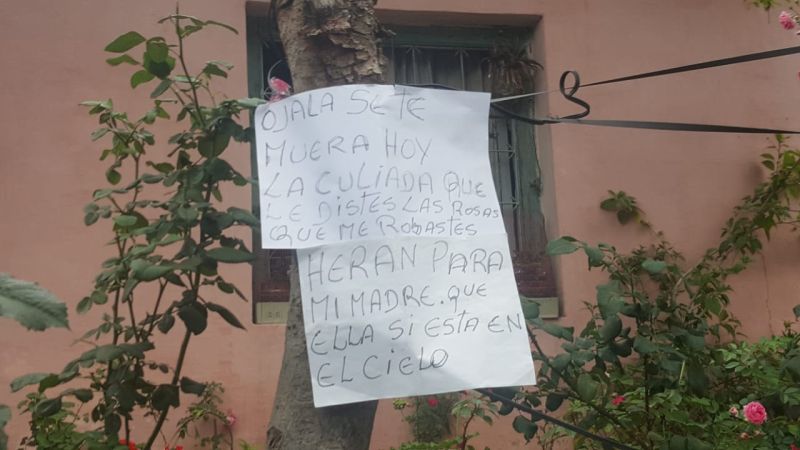 En el jardín, el cartel colgado ayer refleja los peores deseos para quien arrebató las rosas. “Ojalá se te muera hoy la c… que le diste las rosas que me robaste… eran para mi madre que ella si está en el cielo”, dice el mensaje.