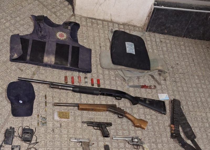En calle Estanislao Learte al 700 de Bº Müler, personal policial detuvo a un hombre de 37 años (registra antecedentes delictivos) con el secuestro de dos chalecos antibalas (uno de ellos con la inscripción de la Policía de Córdoba), vestimentas y accesorios policiales, cinco armas de fuego (dos escopetas, dos pistolas y un revolver), cartuchos de diferentes calibres, un arma blanca, cuatro tablets, cuatro celulares, dos handys, entre otros.
