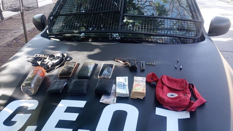 Durante el procedimiento, los efectivos encontraron dentro del habitáculo un frasco con aparentemente marihuana, una pistola calibre 22 con cinco cartuchos, tres teléfonos celulares y una suma de dinero en efectivo.