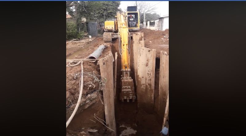 La porosidad de la tierra genera inconvenientes en la obra municipal de colocación de caño de drenaje de napas en Villa El Libertador en Calle Araní al 5200, entre Tilcara y Bogotá.