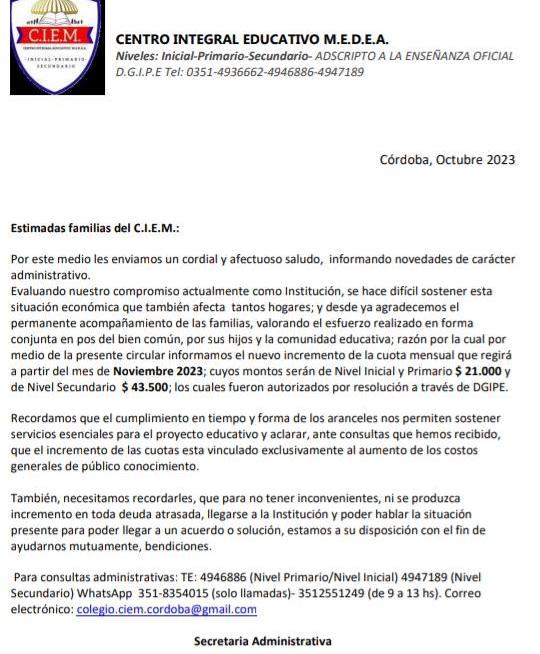 Padres de Villa El Libertador se comunicaron para expresar su malestar y preocupación por el aumento de la cuota escolar mensual y la matrícula en el colegio de Medea, el Ciem (Totorilla 1565 y Río Negro 4997)
