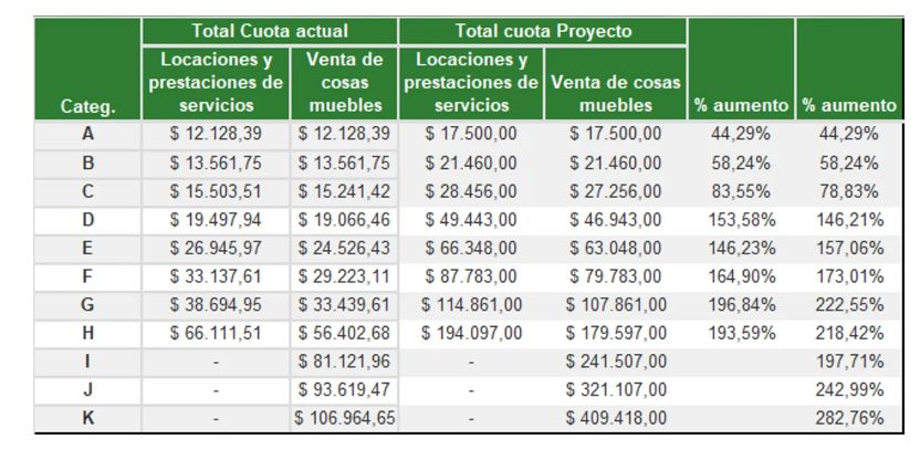 En el caso de las cuotas mensuales, que se conforman de un componente impositivo, uno de obra social y un tercero de jubilación, los aumentos fueron progresivos de la categoría A a la H y van desde el aumento en la cuota de un 44% para la categoría más baja, pasando de pagar por mes $12.128,39 a $17.500. Hasta la categoría H, limite de servicios que de una cuota base de $66.111,51 se va a una cuota de $194.097,00 . Es decir un 194% más. En el caso de venta de cosas muebles, la categoría más alta es la K y la cuota aumenta un 282,76%. Desde los $106964,65 a los $409.418 finales por mes.