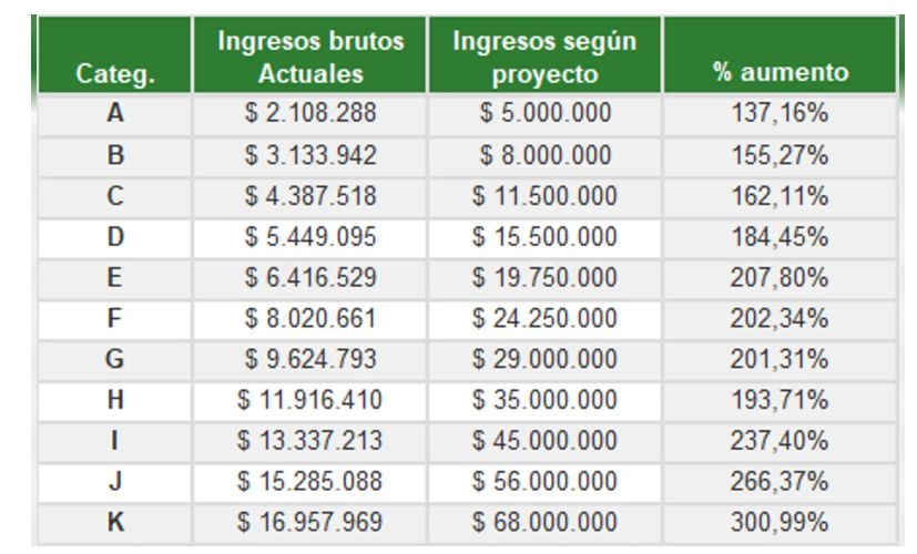 El proyecto, lo que reconoce son escalas mucho mas altas en las categorías al actualizar el limite de Ingresos Brutos (facturación) y también actualiza los valores del componente impositivo, el aporte a la obra social y al sistema de jubilación, con lo cual también suben las cuotas a pagar mensualmente.