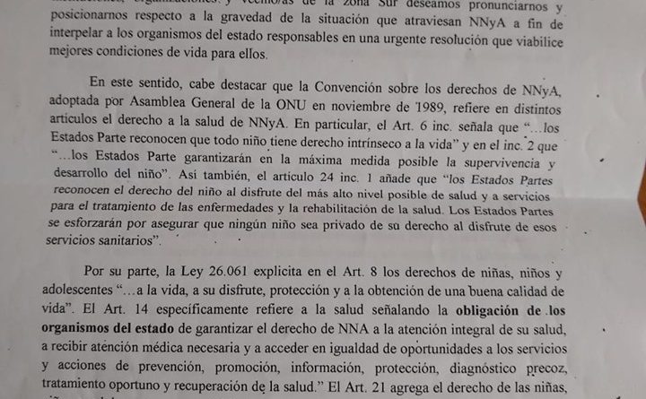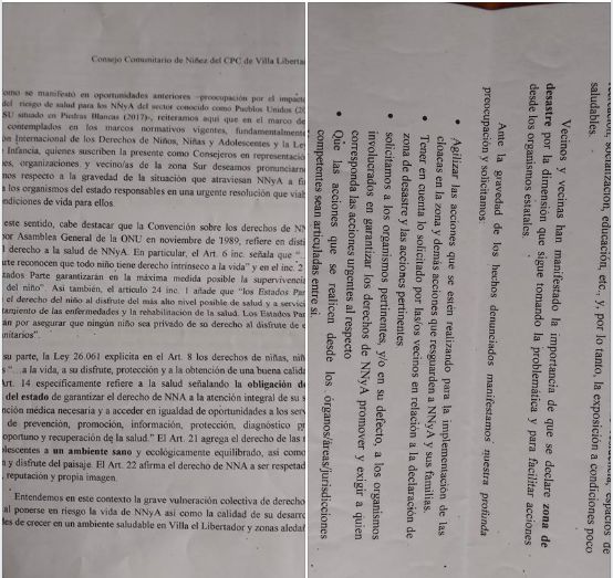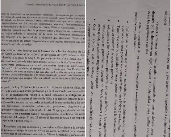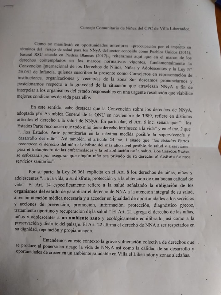 En la nota, el organismo municipal manifiesta su preocupación por la gravedad de la situación socioambiental y la vulneración de derechos de niños y adolescentes por no disfrutar de un ambiente sano.
