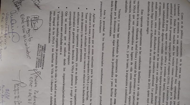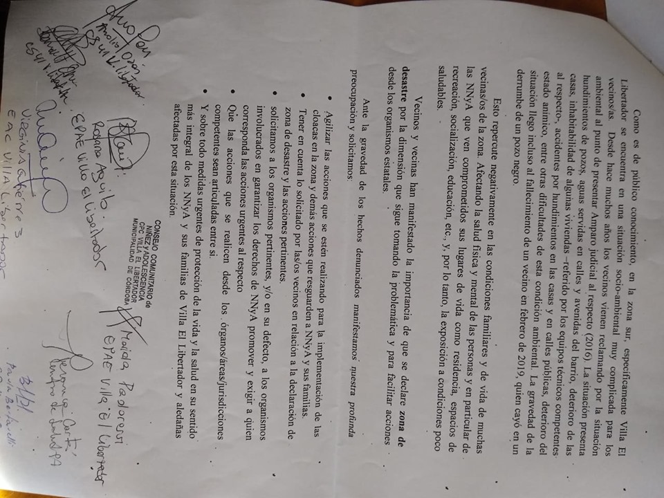 En este sentido solicita la “protección de la vida y salud integral” de ellos y a los organismos que agilicen” la implementación de la obra de cloacas.
