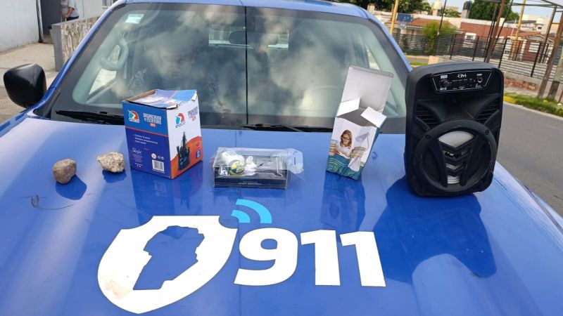 Se secuestraron dos piedras que se usaron para cometer el ilícito y se recuperó un parlante, un auricular, una caja de un velador portátil y dos cajas de cartón organizador.