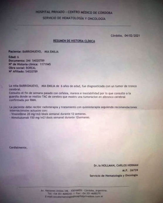 “Mia ya perdió el habla, no camina, y necesitamos la ayuda de la gente, del gobierno, para llevarla afuera y salvarle la vida”, dijo Luján a La Décima. “Sabemos que es mucha plata la que necesitamos, pero si no lo intentamos ella se muere”, agregó la actual pareja de la mamá. El tratamiento en Estados Unidos costaría alrededor de 350 mil dólares.