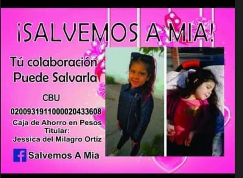 La familia de Mia, que reside en barrio Santa Isabel Segunda Sección (Cajamarca y Cumbre del Perchel), ha iniciado una campaña para juntar fondos a través de la apertura de una cuenta bancaria y de un muro de facebook “Salvemos a Mia” para visibilizar el problema.