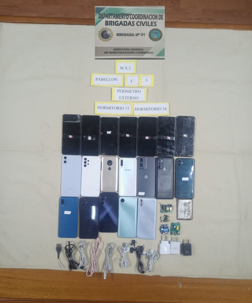 Efectivos de la Dirección de Coordinación de Brigadas Civiles realizaron una serie de allanamientos en un pabellón del complejo Carcelario Bouwer y secuestraron 39 teléfonos celulares, 7 armas blancas, 17 chips de teléfonos, 11 plaquetas cargadores, varias fichas y cables USB, 09 auriculares, 10 baterías de litio, 9 fuentes de alimentación y varios gramos de marihuana y cocaína, entre otros elementos.