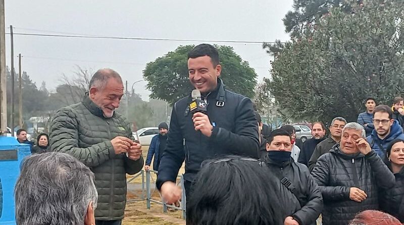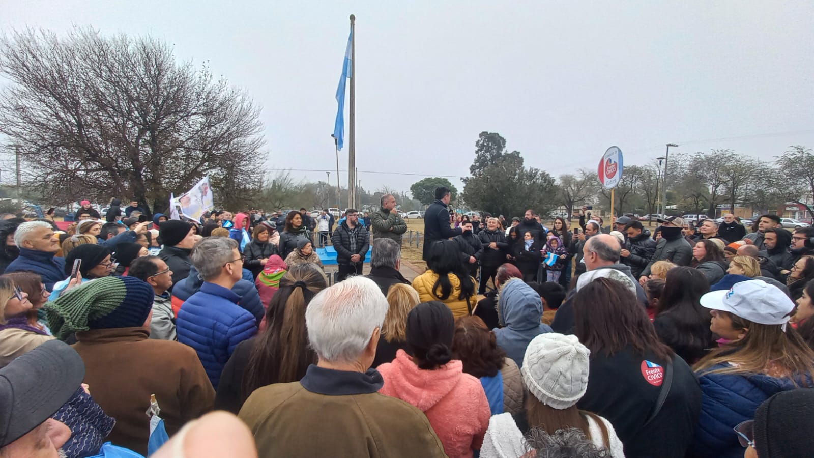 El acto de Juez y De Loredo fue acompañado por un centenar de vecinos de barrios de la zona sur, que llegaron a la Plaza Malvinas Argentinas portando banderas argentinas e insignias partidarias.