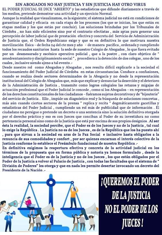 Los letrados firmaron una petición titulada “Los abogados queremos el poder de la justicia, no el poder de los jueces”, donde afirman que las soluciones brindadas por los tribunales de Córdoba en el marco de la cuarentena “han sido efectistas” y “más aptas para generar una percepción de labor judicial que de prestación efectiva y concreta del servicio de administración de justicia”.