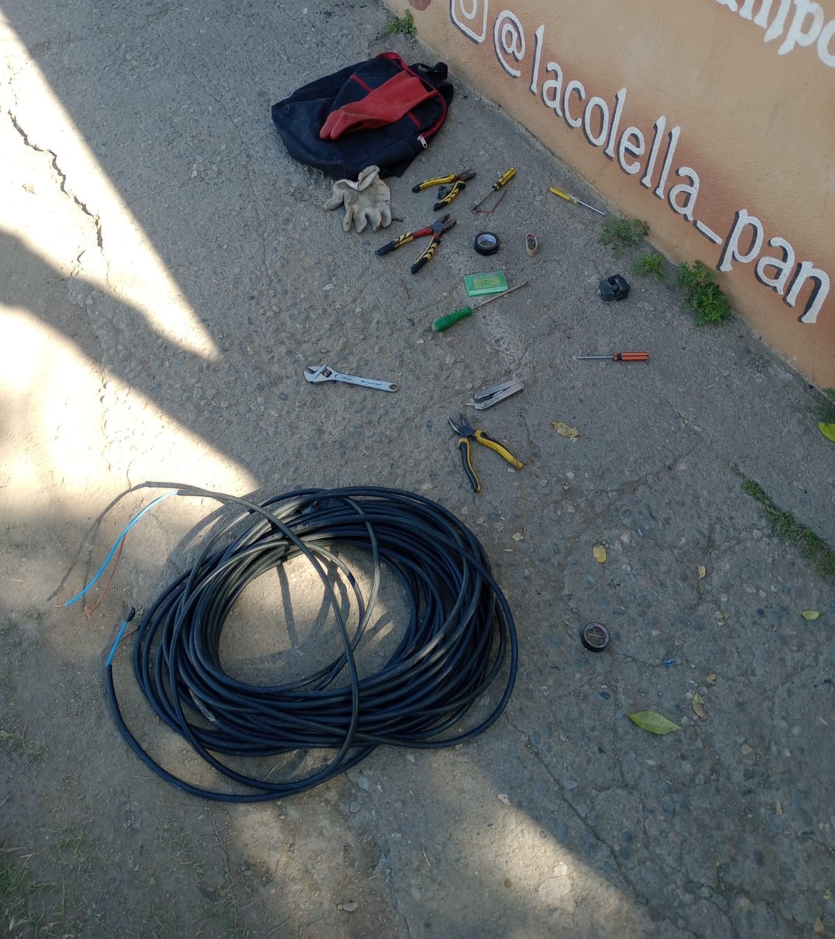 Inmediatamente se procedió a la aprehensión de este hombre con el secuestro de varios metros de cable de cobre, una mochila, un busca polo, una llave inglesa, tres pinzas, un alicate y cuatro destornilladores, entre otras herramientas.