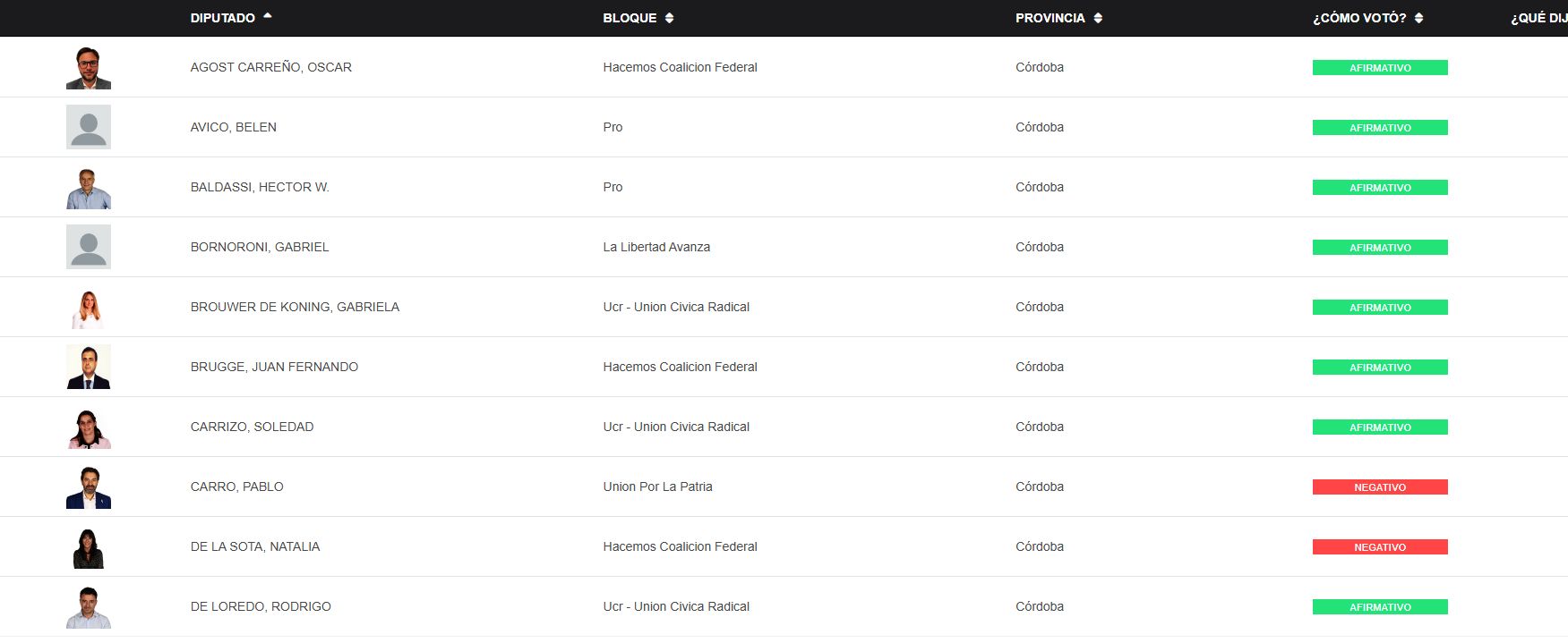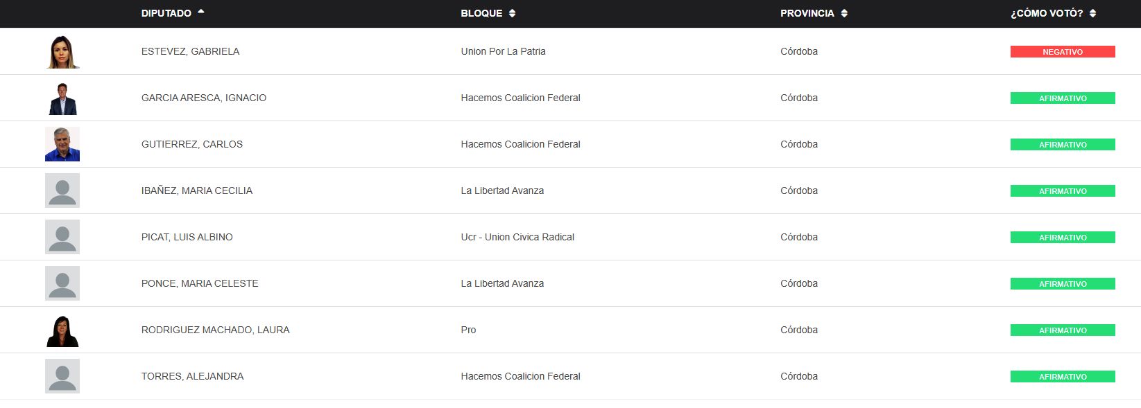 El resto de los 15 diputados votó a favor: 3 del bloque del PRO (Belén Avico, Héctor Baldassi y Laura Rodríguez Machado); 5 por el bloque Hacemos Coalición Federal (Oscar Carreño, Juan Brugge, Ignacio García Aresca, Alejandra Torres y Carlos Gutiérrez); 3 por la Libertad Avanza (Gabriel Bornoroni, María Ibáñez y María Ponce); y 4 por la UCR (Gabriel Brouwer de Koning, Soledad Carrizo, Rodrigo De Loredo y Luis Picat)