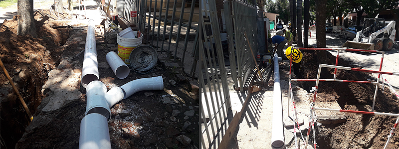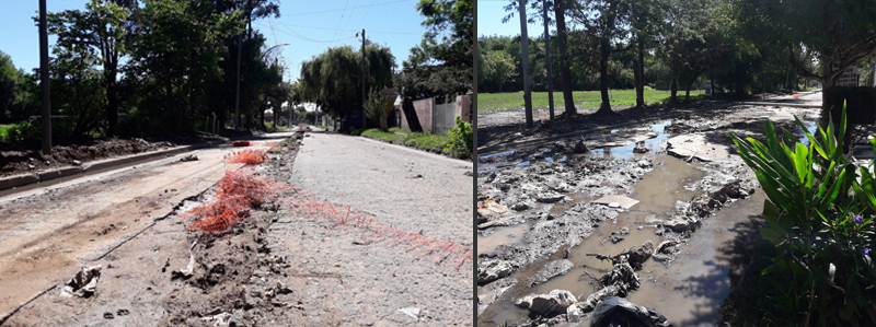 - El segundo frente que avanza a paso firme es el que la municipalidad ejecuta en la calle Viña del Mar para dotar de cloacas al sector del barrio que está en emergencia ambiental. Allí se colocó un caño de 500 ml de diámetro y 400 metros de longitud, a cuatro metros de profundidad, entre Carmelo Ibarra y Defensa. El caño conecta con el troncal o cloaca máxima sur de Defensa. Los trabajos aquí están casi terminados: solo falta terminar de construir tres cámaras de inspección y asfaltar la mitad de la calle. No se pudo avanzar por las lluvias.