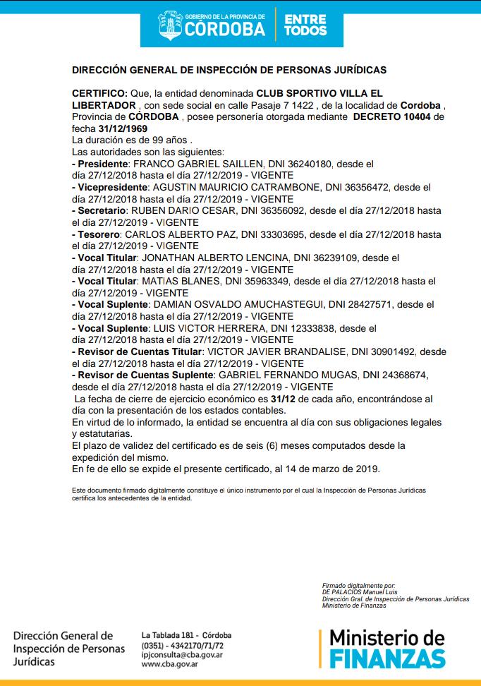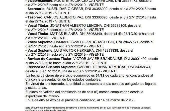 La Dirección General de Inspección de Personas Jurídicas expidió el 14 de marzo pasado el certificado validando a la nueva comisión presidida por Saillén y certificando que “la institución se encuentra al día con sus obligaciones legales y estatutarias”, entre ellas “la presentación de estados contables” adeudados.