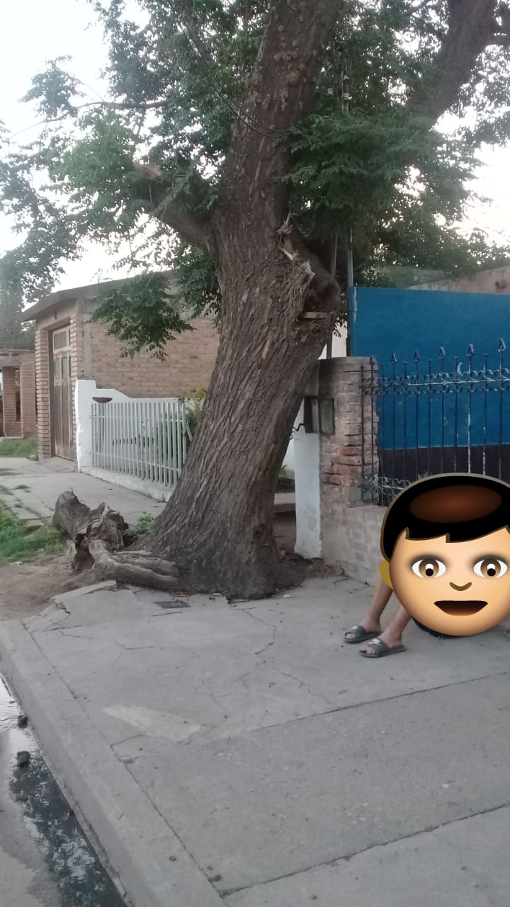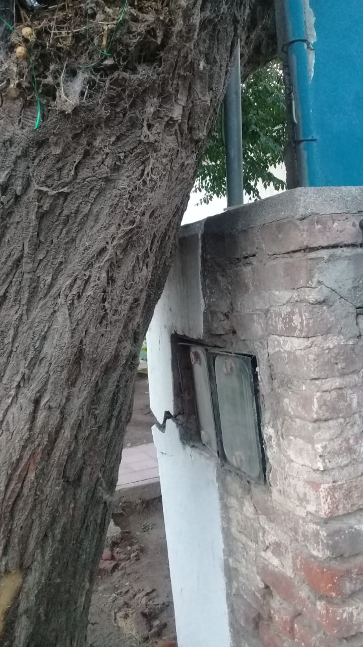 Roxana Oliva (Molinari 5532, entre Gobernación y Pablo De Mauro) cuenta vivir intranquila por un viejo y robusto árbol inclinado y apoyado sobre el pilar de la bajada de la luz de su casa.