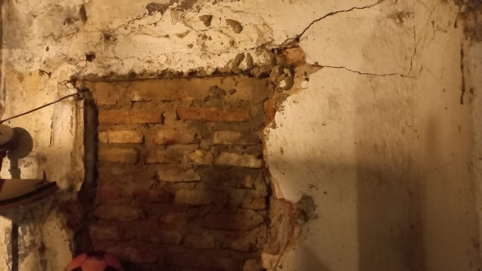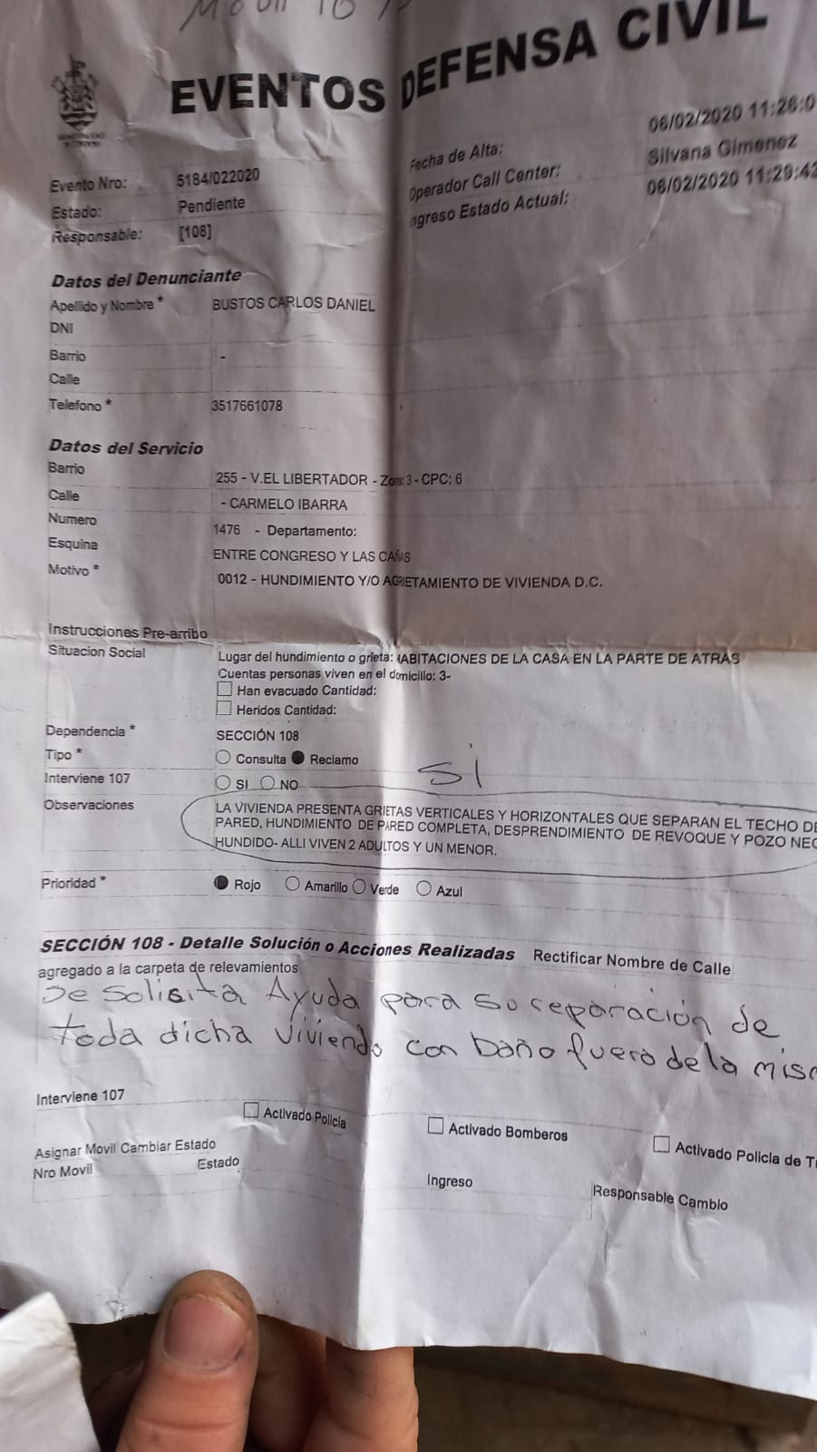 “Presenta grietas verticales y horizontales que separan la pared del techo, hundimiento de pared completa, desprendimiento de revoque y pozo negro hundido. Allí viven dos adultos y un menor”, dicen las observaciones contenidas en la foja Eventos Defensa Civil. Su caso es de prioridad “Rojo”.