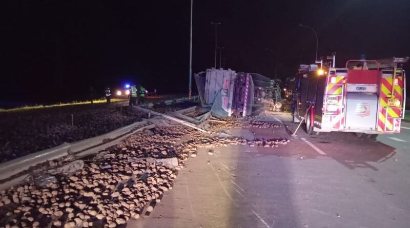 En horas de la madrugada, un camión Mercedes Benz con semirremolque que trasladaba 44 mil kg de papas, volcó en la intersección de Ruta 60 y Ruta 9 Norte, a la altura de la localidad de Sarmiento, departamento Totoral.